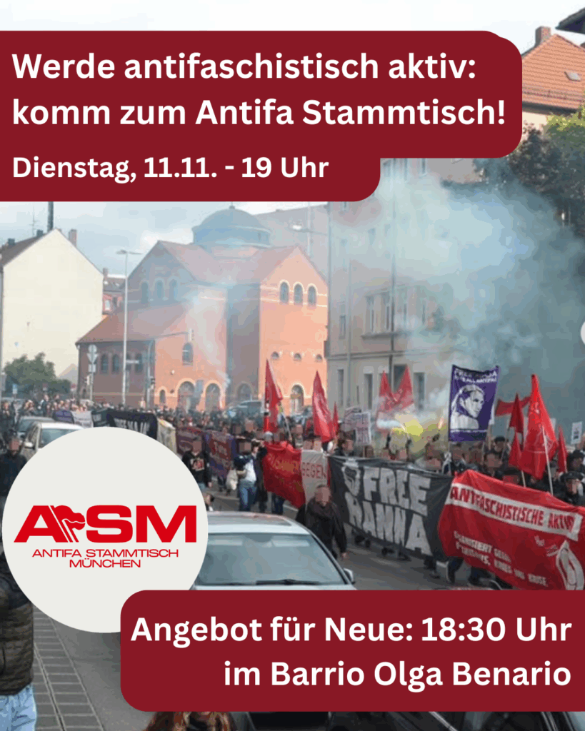 Wenn ihr zum ersten mal kommen wollt, seid am besten schon um 18:30 Uhr da, um uns als Antifa-Stammtisch München besser kennen lernen zu können! Also kommt gerne rum!