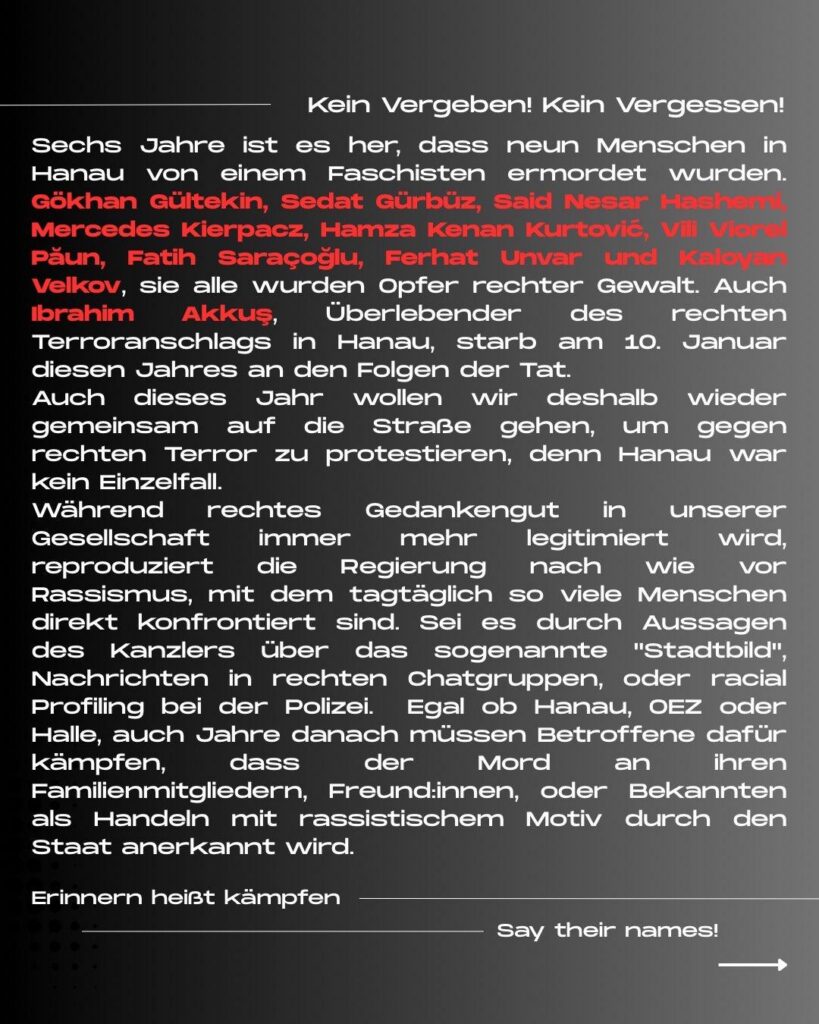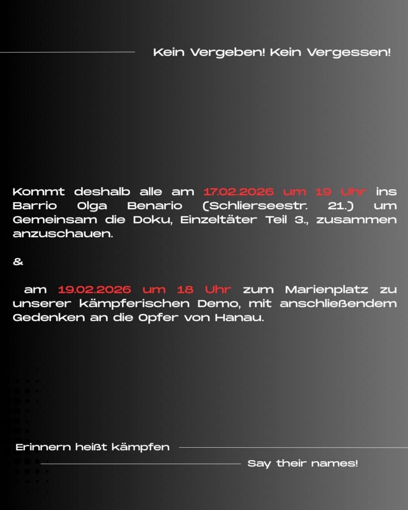 Und kommt anschließend Alle am 19.02.2026 um 18 Uhr zum Marienplatz zu unserer kämpferischen Demo, mit anschließendem Gedenken an die Opfer von Hanau.