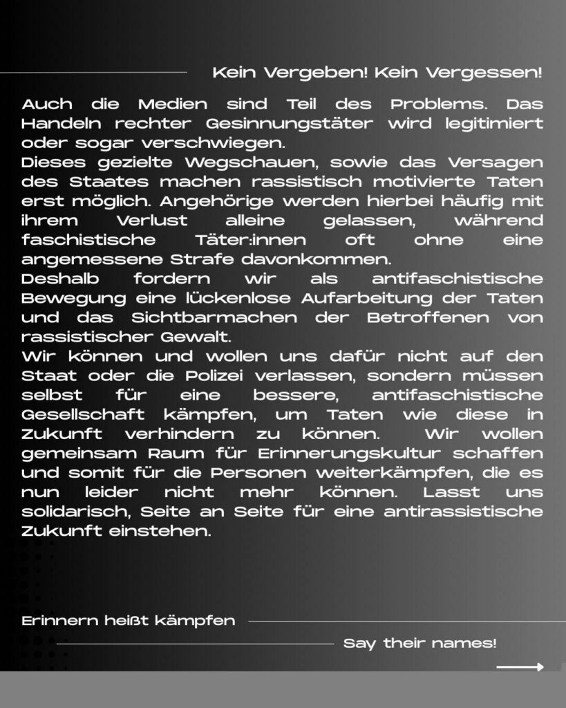 Wir können und wollen uns dafür nicht auf den Staat oder die Polizei verlassen, sondern müssen selbst für eine bessere Gesellschaft kämpfen, um Taten wie diese in Zukunft verhindern zu können. Wir wollen gemeinsam Raum für Erinnerungskultur schaffen und somit für die Personen weiterkämpfen, die es nun leider nicht mehr können. Lasst uns solidarisch, Seite an Seite für eine antirassistische Zukunft einstehen.