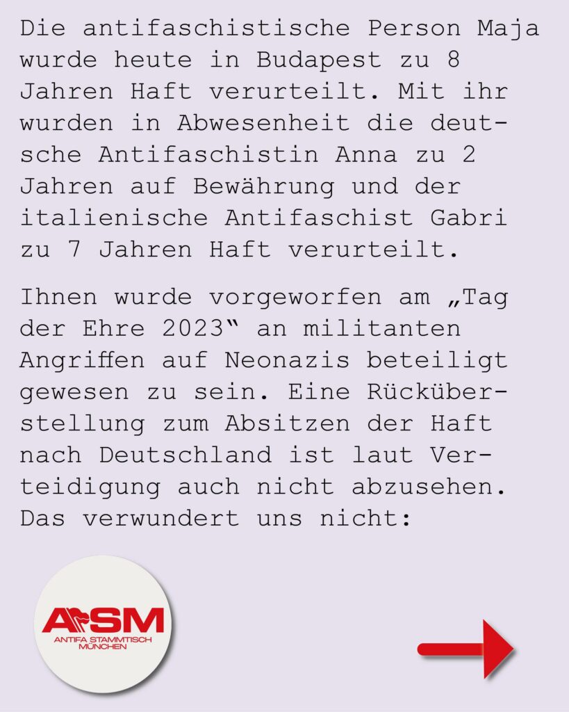 Die antifaschistische Person Maja wurde heute in Budapest zu 8Jahren Haft verurteilt. Mit ihr wurden in Abwesenheit die deutsche Antifaschistin Anna zu 2 Jahren auf Bewährung und der italienische Antifaschist Gabri zu 7 Jahren Haft verurteilt.