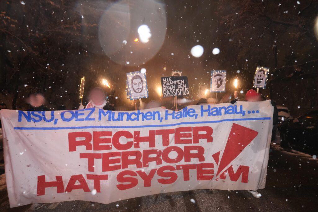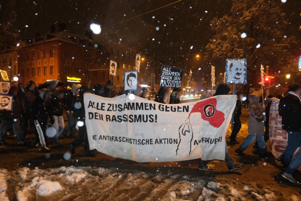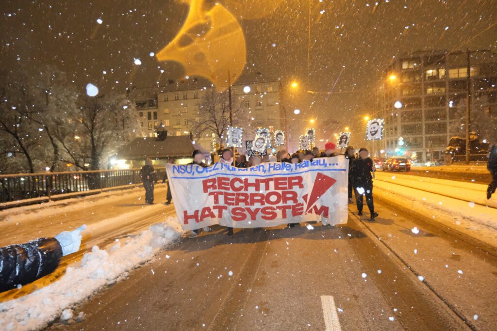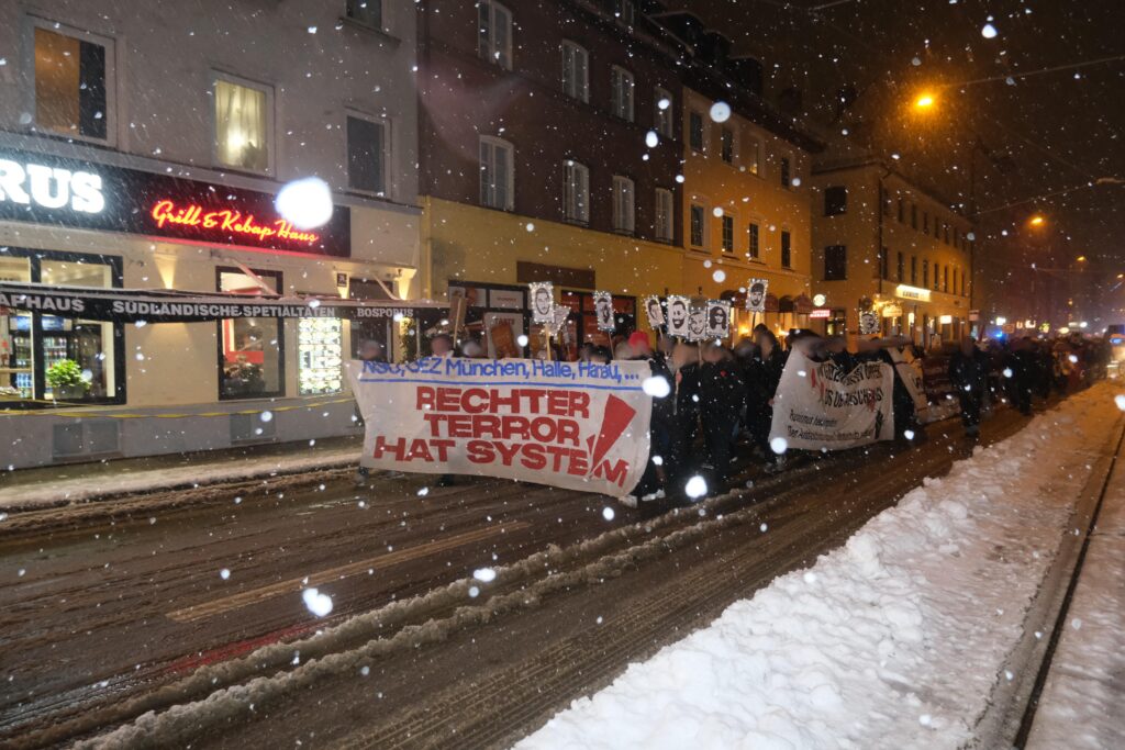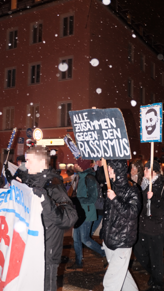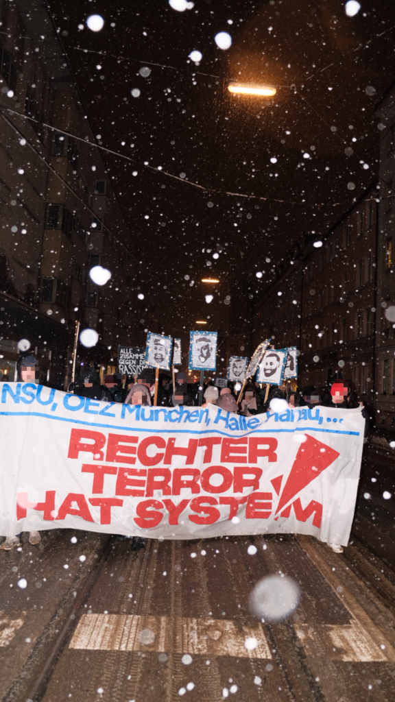 Mit in der Spitze 500 Menschen haben wir uns heute gemeinsam in München den Ermordeten vom 19. Februar 2020 gedacht, unsere Wut rausgelassen und uns gegenseitig unsere Solidarität und Kollektivität gezeigt. Diese Kollektivität zeigt sich auch in den Organisationen und ihren Redebeiträgen, die an der Demonstration teilnahmen. Die DGB Jugend und der AK Ver.di gegen Rechts verdeutlichten in ihren Rede dass die Spaltung unserer Klasse nicht zwischen vermeintlich “Deutschen” und Nicht-Deutschen”, sondern zwischen unten und oben verläuft und wir in unseren Schulen, Unis und Betrieben gemeinsam gegen Rassismus stehen müssen. Der Internationale Jugendverein und das kurdische Gesellschaftszetrum sprachen über die Auswirkungen von Rassismus. Wir – als Antifaschistischer Stammtisch München – betonten die Notwendigkeit einer dauerhaften und ernsthaften antifaschistischen und antirassistischen Organisierung. Mit Sibel Leyla sprach die Mutter des Ermordeten Can Leyla von der “Initative München OEZ erinnern” und zeigte sehr kämpferisch ihre Wut und Trauer. Waseem rappte am Ende seinen Song “Für immer” in Erinnerung an Armela, Can, Dijamant, Guiliano, Hüseyin, Roberto, Sabine, Selçuk und Sevda. Denn dieses Jahr, jährt sich am 22. Juli auch der rechte Terroranschlag auf das Münchner Olympia-Einkaufszentrum zum zehnten Mal. Gerade deshalb war es uns in diesem Jahr besonders wichtig die Kontinuität rechten Terrors zu verdeutlichen. Denn rechter Terror ist kein Einzelfall, sondern kontnuierlich und sein Ursprung liegt im System dieser kapitalistischen Gesellschaftsordnung.