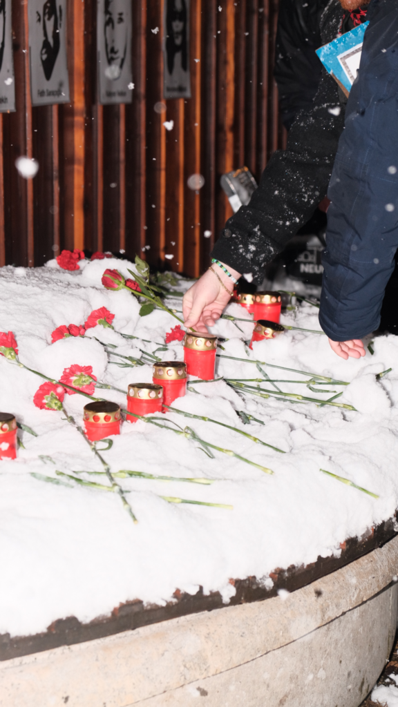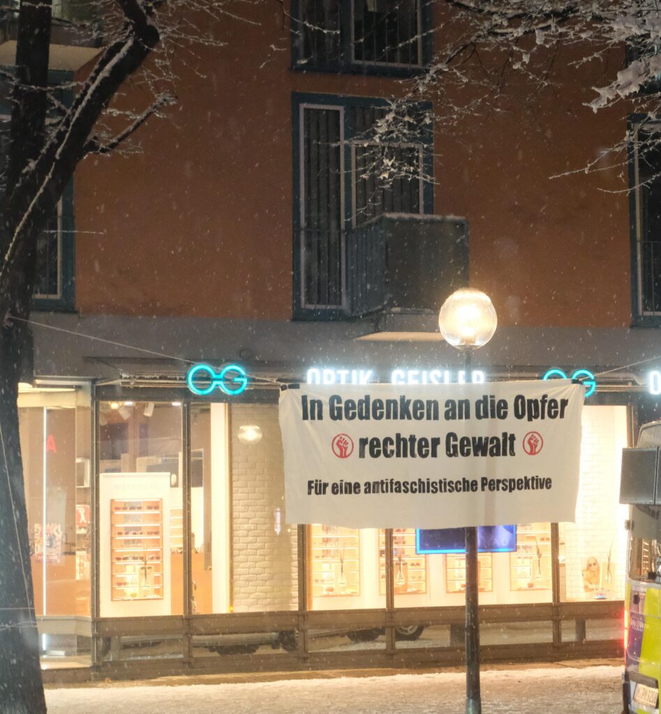 Am Ende der Demonstration erwartete uns ein Gedenkort mit den Porträts der zehn Verstorbenen und einem aufgehängten Transparent (“In Gedenken an die Opfer rechter Gewalt”), welche Antifaschist:innen im Vorhinein eingerichtet hatten. Gemeinsam lauschten wir hier noch den Liedern, die explizit für die Ermordeten von Hanau, als auch für die des OEZ-Attentats geschrieben wurden und legten Kerzen und Blumen nieder.