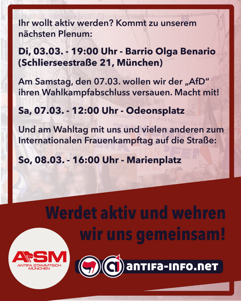Am Samstag, den 07.03.2026, wollen wir der “AfD” ihren Wahlkampfabschluss versauen. beteiligt euch am Protest: 07.03.26 – 12 Uhr – Odeonsplatz