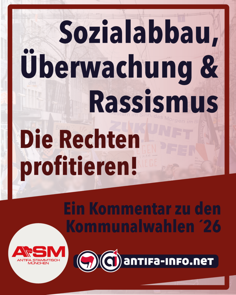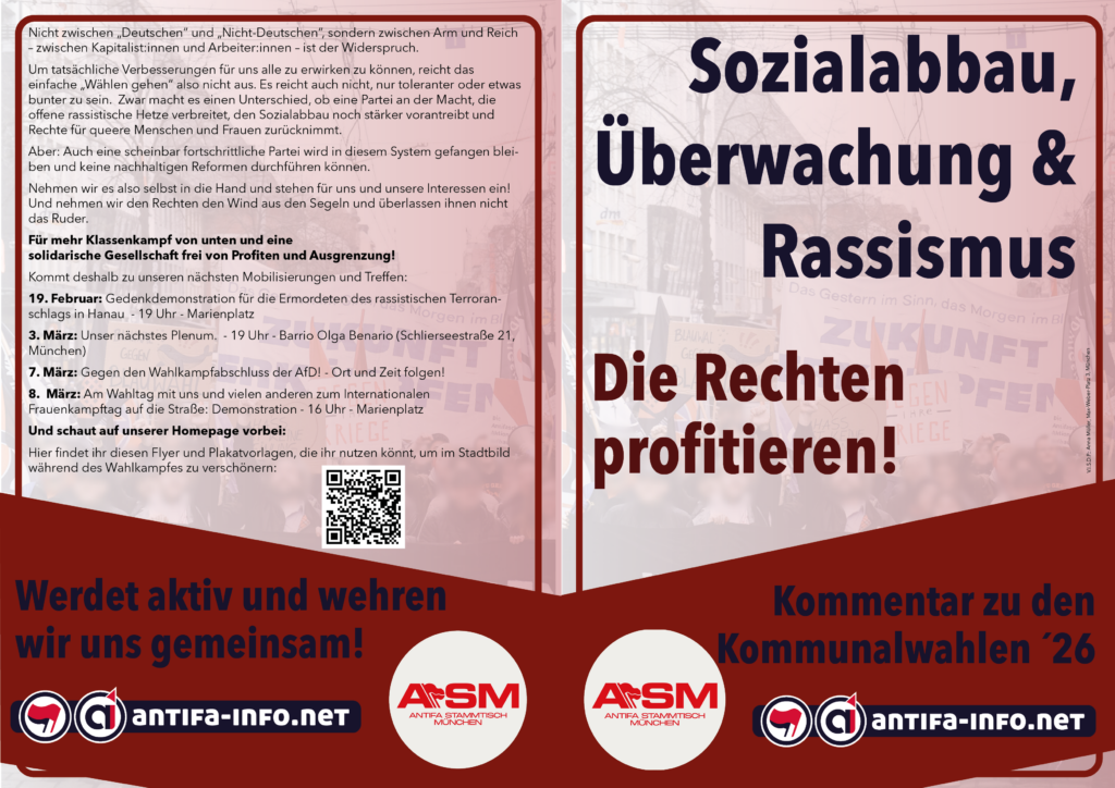 Der Antifa Stammtisch München (ASM) ist offenes Treffen, zu dem alle eingeladen sind, die sich antifaschistisch engagieren wollen. Egal, wo ihr herkommt, wie alt ihr seid, oder ob ihr schon Erfahrung in antifaschistischer Arbeit habt. Alle zwei Wochen treffen wir uns dienstags im Barrio Olga Benario (Schlierseestraße 21, Giesing), um uns auszutauschen, zu vernetzen, zu bilden und gemeinsam Aktionen zu planen. Unser nächstes Plenum findet am 11.November 2025 um 19 Uhr statt.