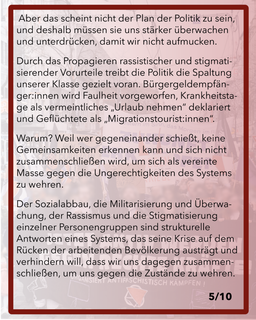 Der Sozialabbau, die Militarisierung und Überwachung und der Rassismus und die Stigmatisierung einzelner Personengruppen sind strukturelle Antworten eines Systems, das seine Krise auf dem Rücken der arbeitenden Bevölkerung austrägt und verhindern will, dass wir uns dagegen zusammenschließen, um uns gegen die Zustände zu wehren.
