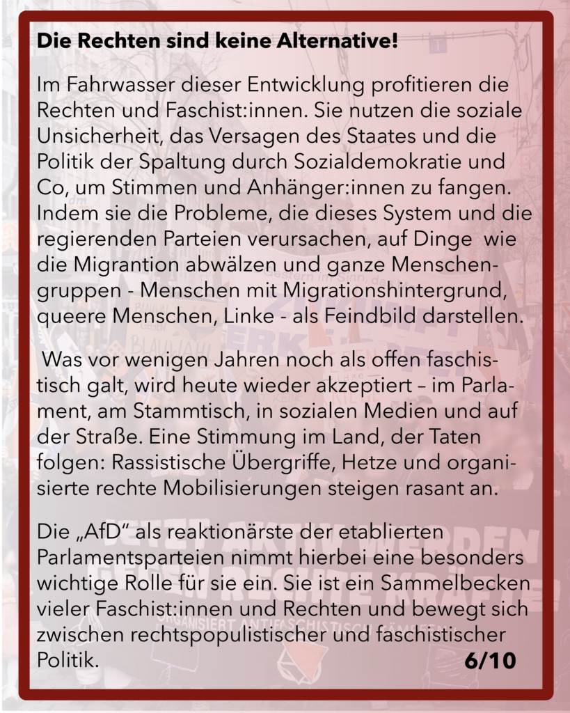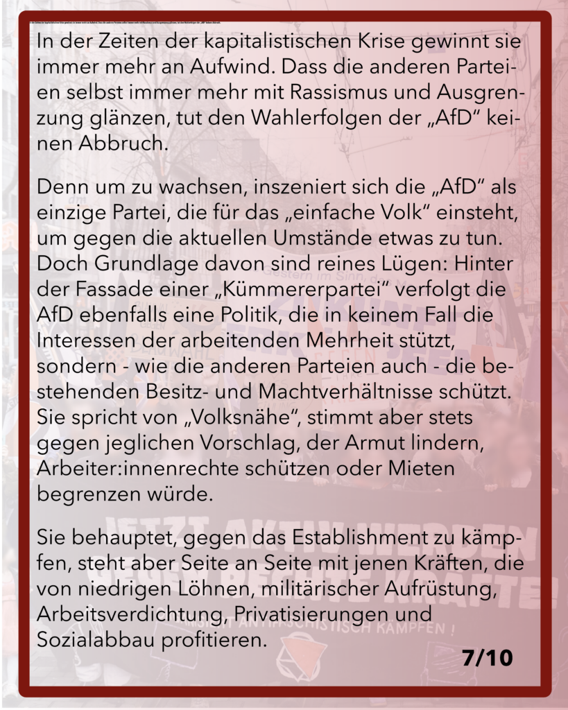 Die „AfD“ als reaktionärste der etablierten Parlamentsparteien nimmt hierbei eine besonders wichtige Rolle für sie ein. Sie ist ein Sammelbecken vieler Faschist:innen und Rechten und bewegt sich zwischen rechtspopulistischer und faschistischer Politik und gewinnt in der Zeiten der kapitalistischen Krise immer mehr an Aufwind. Dass die anderen Parteien selbst immer mehr mit Rassismus und Ausgrenzung glänzen, tut den Wahlerfolgen der „AfD“ keinen Abbruch.