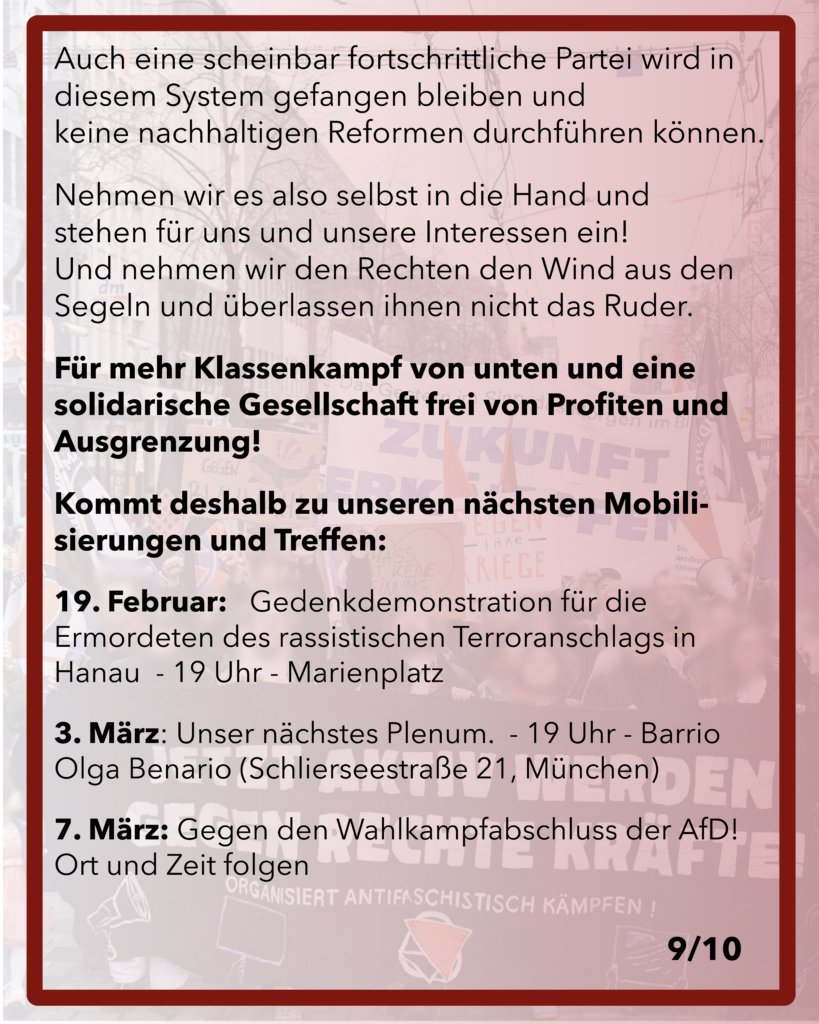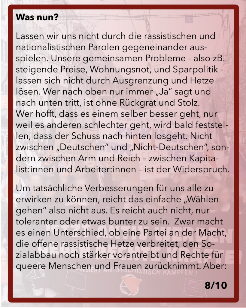 Lassen wir uns nicht durch die rassistischen und nationalistischen Parolen gegeneinander ausspielen. Unsere gemeinsamen Probleme, wie steigende Preise, Wohnungsnot, und Sparpolitik lassen sich nicht durch Ausgrenzung und Hetze lösen. Wer nach oben nur immer „Ja“ sagt und nach unten tritt, ist ohne Rückgrat und Stolz. Wer hofft, dass es einem selber besser geht, nur weil es anderen schlechter geht, wird bald feststellen, dass der Schuss nach hinten losgeht. Nicht zwischen „Deutschen“ und „Nicht-Deutschen“, sondern zwischen Arm und Reich – zwischen Kapitalist:innen und Arbeiter:innen – ist der Widerspruch.