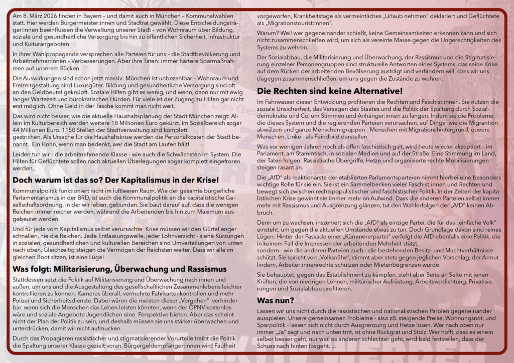 Am 8. März 2026 finden in Bayern – und damit auch in München – Kommunalwahlen statt. Hier werden Bürgermeister:innen und Stadtrat gewählt. Diese Entscheidungsträger:innen beeinflussen die Verwaltung unserer Stadt – von Wohnraum über Bildung, soziale und gesundheitliche Versorgung bis hin zu öffentlichen Sicherheit, Infrastruktur und Kulturangeboten.